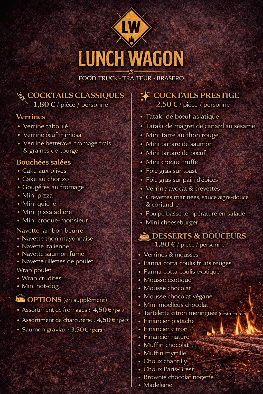La formule brasero offre une expérience premium et immersive. Les cuissons au feu de bois deviennent un véritable spectacle culinaire, où les produits frais sont préparés devant les invités dans une ambiance chaleureuse et élégante.