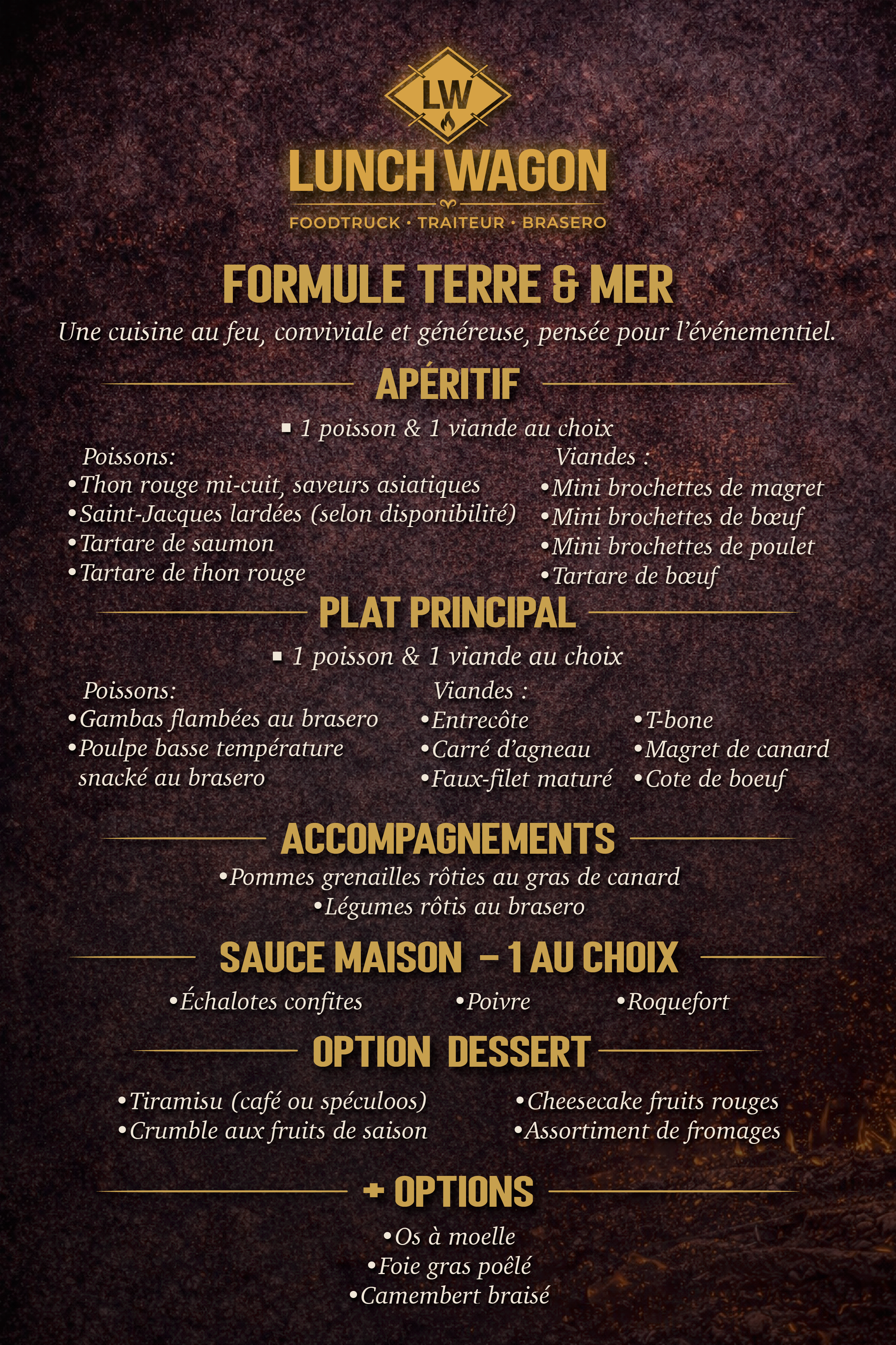 Enfin, la formule Terre & Mer offre une expérience complète où poissons, viandes maturées et accompagnements se rencontrent autour des braises, avec des options signatures pour sublimer l’événement.